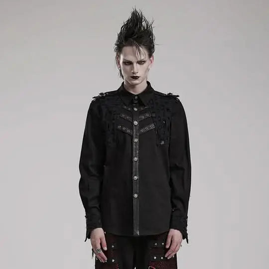 The Corpse Paint Dress Shirt stands out with its unique contrasted splicing, adding a touch of visual intrigue that is both haunting and captivating. The center-front patchwork is meticulously crafted, offering a textured dimension that complements the distressed fabric details on the neckline and cuffs. These elements combine to create a shirt that is both sophisticated and rebellious, perfect for those who dare to defy the ordinary.