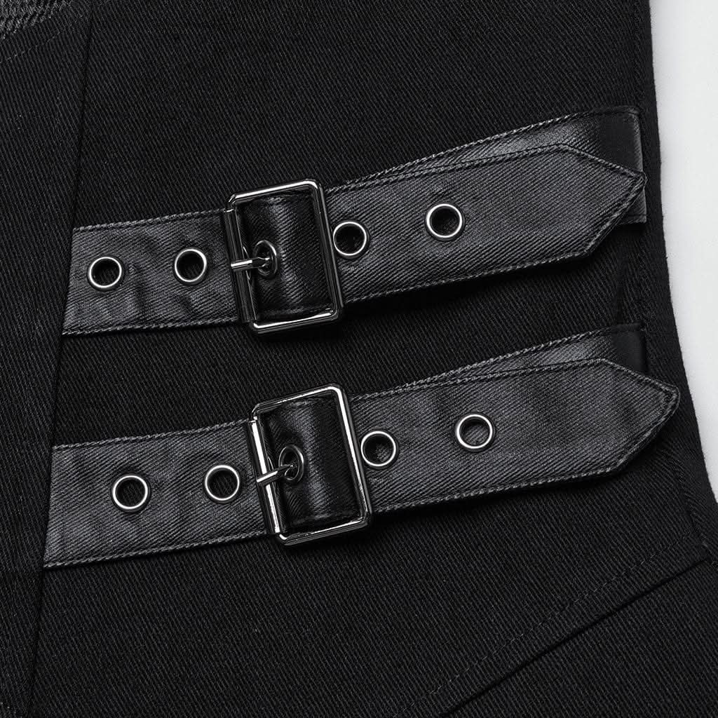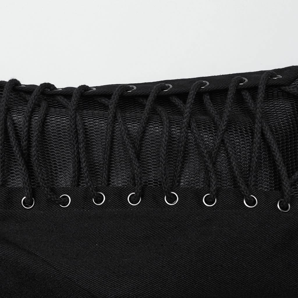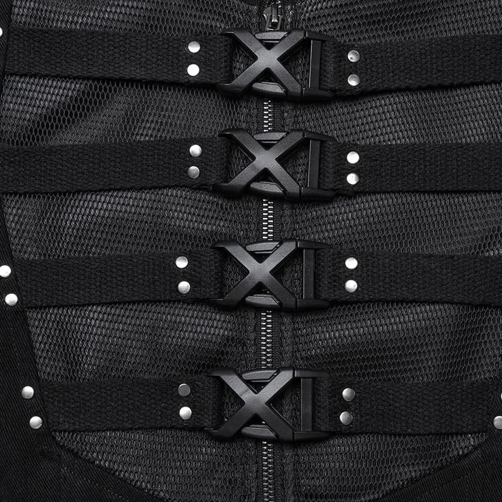 The bold front X-shaped buckles and arm straps of the Umbracryph Jacket exude a raw, rebellious energy. The irregular double-layered design adds a touch of structured chaos, creating a silhouette that is both striking and sophisticated. The underlayer of sleek, rubberized imitation leather introduces an industrial edge, while the intricate mesh overlay completes the look with a bold, multi-dimensional flair.