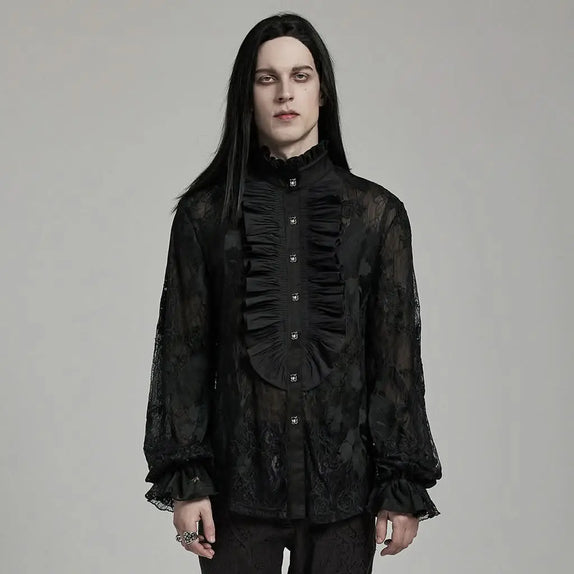 Unleash your inner sorceress with the enchanting Necromancy Dress Shirt, a must-have for any gothic wardrobe. This captivating dress shirt is crafted from exquisite mesh fabric adorned with a delicate floral print, perfectly blending elegance with a touch of the macabre. The intricate ruffles on the neckline add a romantic flair, while the dramatic lantern sleeves evoke an air of mystery and allure.