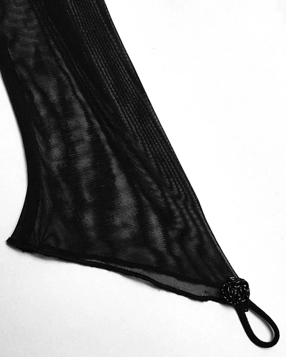 Intricate floral embroidery adds a touch of romantic detail, enhancing the dress's ethereal beauty. The fishtail hem flows gracefully, capturing the essence of gothic allure with every step. Elastic cuffs, designed to loop around the fingers, add a unique, enchanting element, while the button closure at the back of the neck ensures ease of wear.