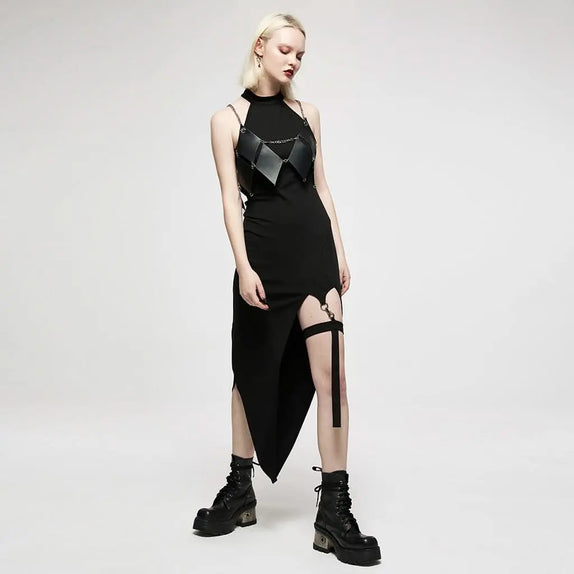Embrace your inner enchantress with the Pagan Heart Halterneck Dress With Garter, a spellbinding addition to any gothic wardrobe. This captivating dress features a striking halterneck design that elegantly frames the shoulders, while the asymmetrical hemline adds a touch of mystery and allure. Perfect for those who dare to stand out, this dress is crafted from a stretchable fabric, ensuring comfort as you weave your magic.