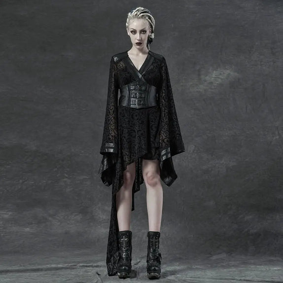 Featuring long, flared kimono sleeves trimmed with PU leather and lace appliques, this dress exudes an air of dark romance. Its asymmetrical hemline enhances the flowing silhouette, allowing you to move with ghostly grace. Whether you're conjuring spirits or making a statement at your next gothic gathering, the Yuurei Kimono Dress is your ultimate attire for an unforgettable entrance.