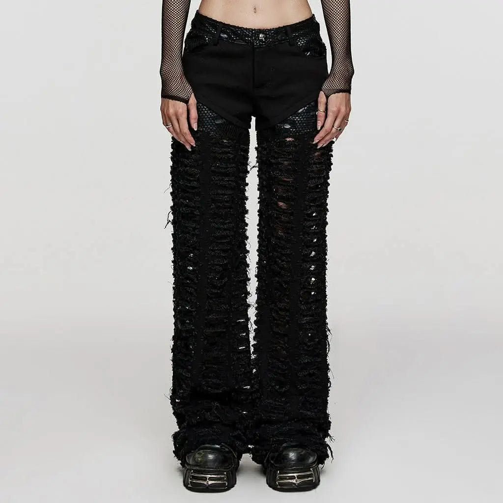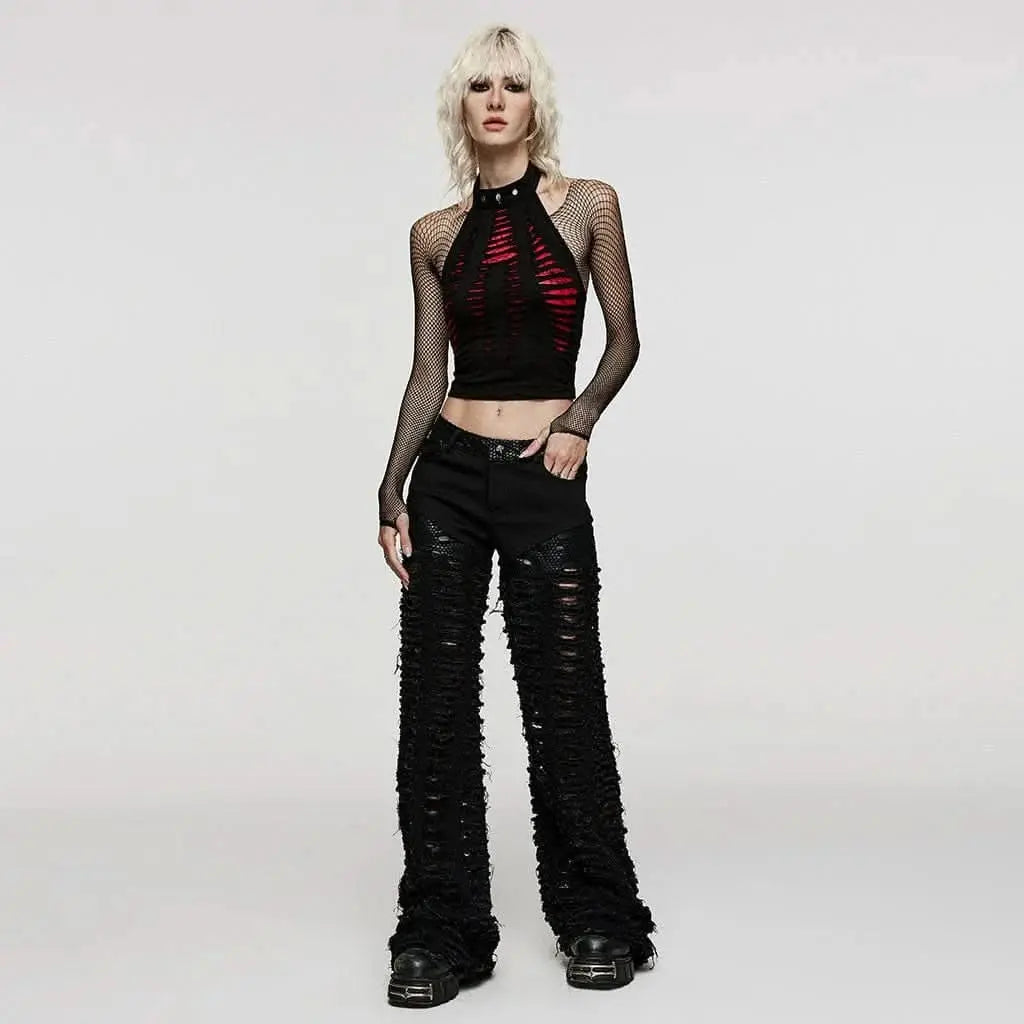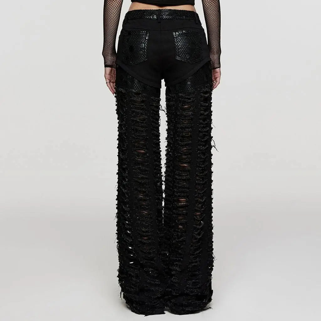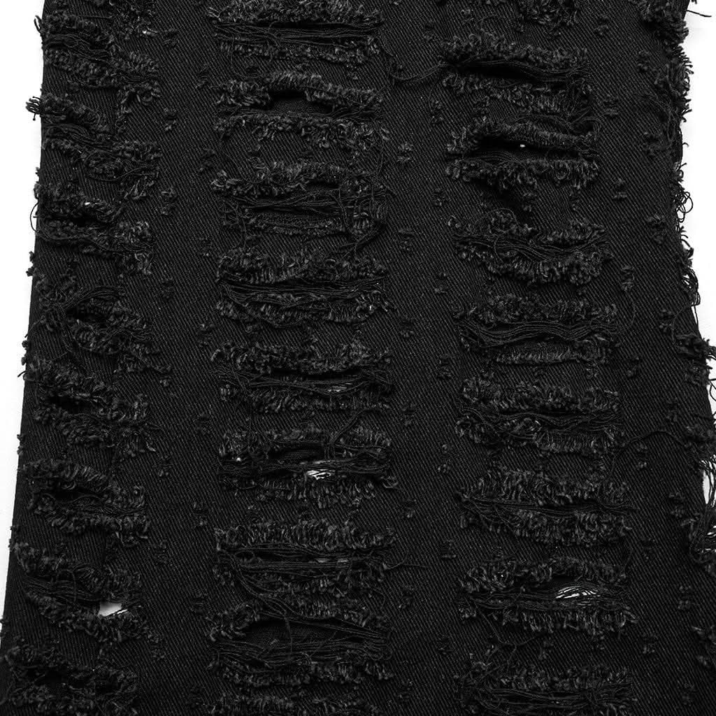 Step into the realm of dark allure with the Fulgurous Trousers, crafted for those who embrace the gothic lifestyle with unapologetic flair. These trousers are more than just a piece of clothing; they're a statement of bold rebellion. With distressed rips artfully placed along the legs and intricate mesh patchwork, each pair tells a story of defiance and raw edge, perfectly capturing the essence of punk-inspired fashion.