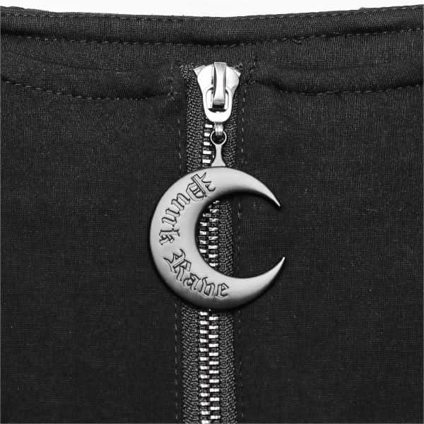 Practicality meets dark allure with the uniquely curved-cut pockets, each adorned with striking skull buttons that add a touch of macabre elegance. The front zipper closure, highlighted by a custom ‘Punkrave’ crescent pendant, completes this daring ensemble, offering a subtle nod to the mystical and the mysterious. Whether you're commanding attention at a gothic gathering or adding an edge to your everyday look, the Wyrmshade Flared Pants are your ultimate statement piece. Embrace the allure of the night and let these pants be your guide to a world where fashion knows no bounds.