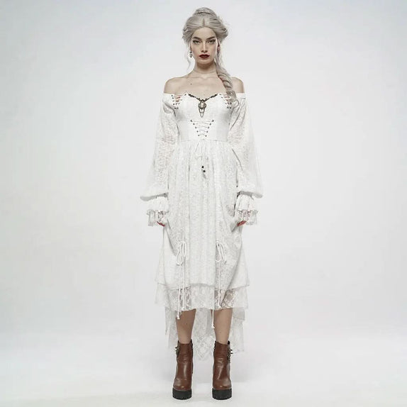 Step into the ethereal world of gothic fashion with the Amelia Devout Dress, a masterpiece that embodies both mystery and romance. This enchanting white dress is designed to captivate, featuring an off-shoulders design that gracefully highlights your neckline. The adjustable front and back lacing allow you to create a silhouette that is uniquely yours, adding a touch of personal flair to your gothic ensemble.