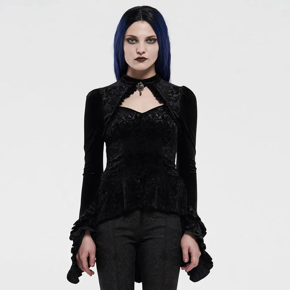 Step into a world of enchanting darkness with our exquisite goth t-shirt, designed for those who dare to express their unique style. This stunning floral velvet piece is more than just a t-shirt; it's a statement. Featuring a dramatic cut-out back and a pointed tail, this t-shirt captures the essence of gothic elegance. The long black bell sleeves add a touch of mystery, while the smoky crystal gothic brooch embellishes the keyhole neckline, offering a hint of opulence.
