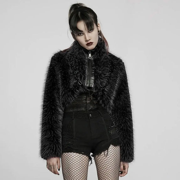 Embrace the dark and mysterious with the Eclipse Cropped Fur Jacket—where style meets the shadows. Elevate your gothic wardrobe today and let your inner darkness shine.