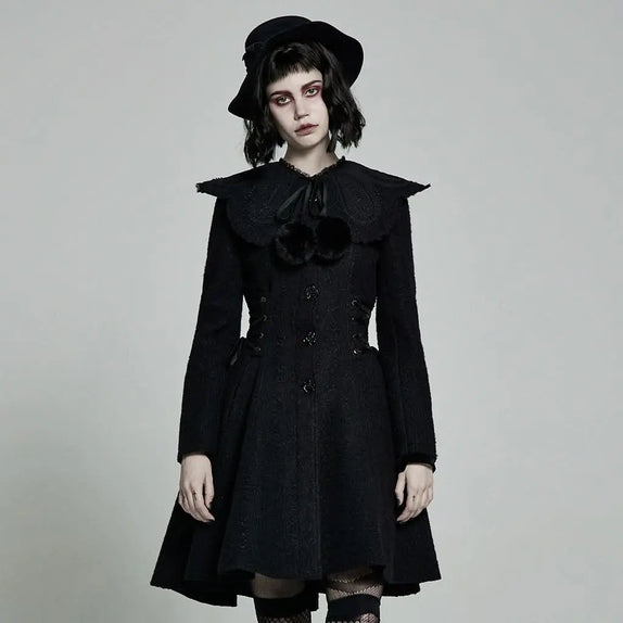 Step into the world of gothic fashion with the exquisite Esther Coat, a must-have for any gothic wardrobe. This stunning coat captures the essence of gothic elegance with its intricate details and dark allure. The Esther Coat is designed to make a statement, featuring a removable flared collar adorned with black faux fur pompoms, perfect for those who love versatility in their style.