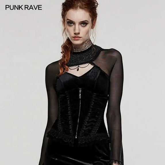 Crafted for those who embrace the whispers of the witching hour, this gothic corset is adorned with intricate lace trim that enhances its dark, romantic aesthetic. The zipper fly ensures ease of wear, while the embroidered velvet provides a luxurious texture that is both captivating and unique.