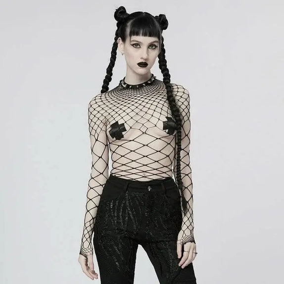 Step into your gothic realm with the Eternal Vacation Mesh Bodysuit in black, a must-have for those who embrace the dark and mysterious. This bodysuit features a striking diamond mesh fabric that adds an edge to your alternative wardrobe. The high neckline offers a touch of elegance, while the elastic fabric ensures comfort and flexibility, making it perfect for day or night adventures.