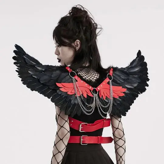 The Sinister Whispers harness is a masterpiece of gothic fashion, combining elegance with a touch of rebellion. The alloy metal details add a hint of industrial edge, while the faux feathers lend an ethereal quality to the wings, making this harness a true statement piece.