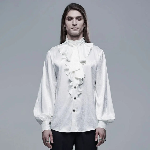 Step into the realm of gothic sophistication with the Alaric Shirt in white. This exquisite shirt is crafted from a textured brocade satin-feel fabric, offering a touch of luxury and comfort with added Spandex for elasticity. Perfect for those who wish to channel their inner Victorian vampire, the Alaric Shirt is a statement piece that combines elegance with a hint of mystery.