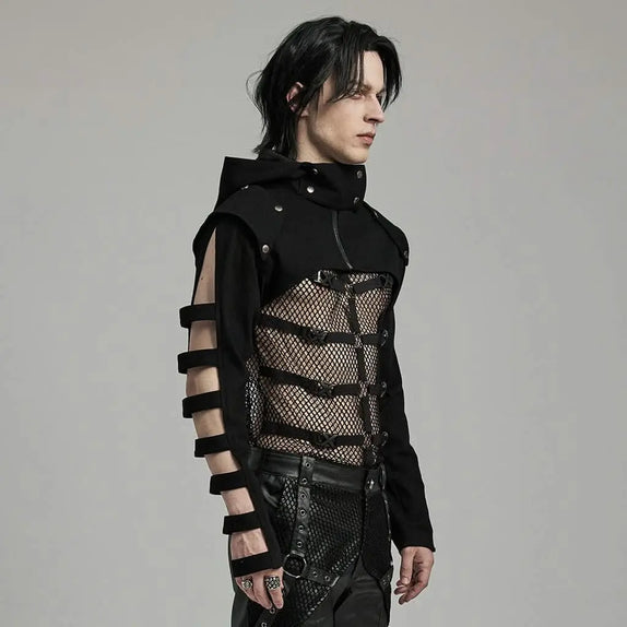 Backfire Mesh Spliced Top features a high neckline, a hood and full sleeves with slits. The centre-front is spliced with mesh and lined with decorative straps that are connected together with buckles. There is a zipper on the neckline.