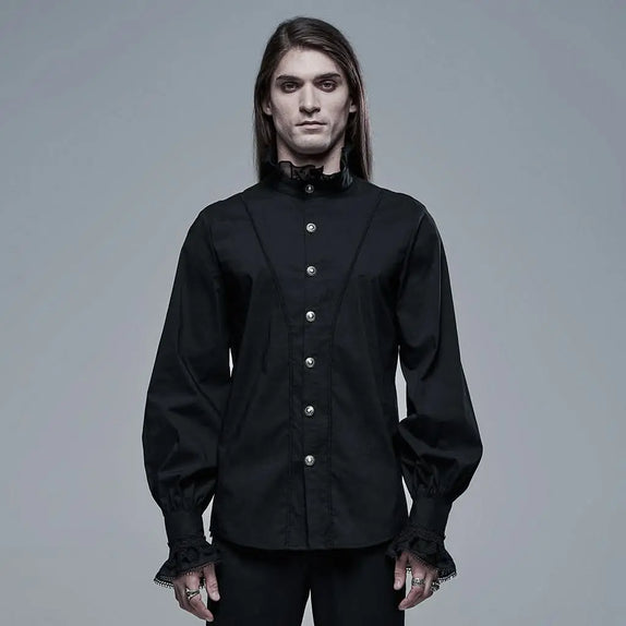 Designed with meticulous attention to detail, this shirt boasts antique-inspired gothic elements that capture the essence of a bygone era. The high collar and cuffs are adorned with delicate ruffles, adding a dramatic flair to your attire. The large puffed sleeves enhance the shirt's vintage appeal, while the antique silver buttons provide a striking contrast against the deep black fabric.