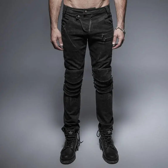 Step into the enigmatic world of gothic fashion with our Dark Stratum Trousers, a must-have for any dark wardrobe. These trousers are designed to captivate with their intricate details and bold style, perfect for those who dare to defy the ordinary. The layered knee design creates a striking armor effect, adding a touch of medieval allure to your ensemble.