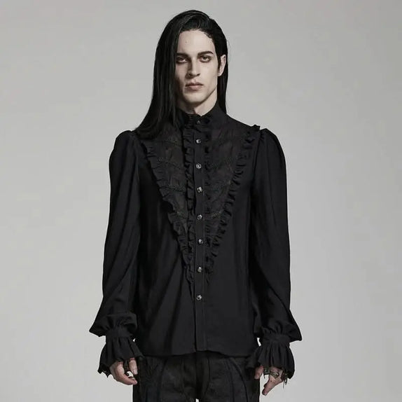 This gothic shirt features a high collar for a commanding presence, lantern sleeves for a touch of drama, and pleated panels down the centre front.