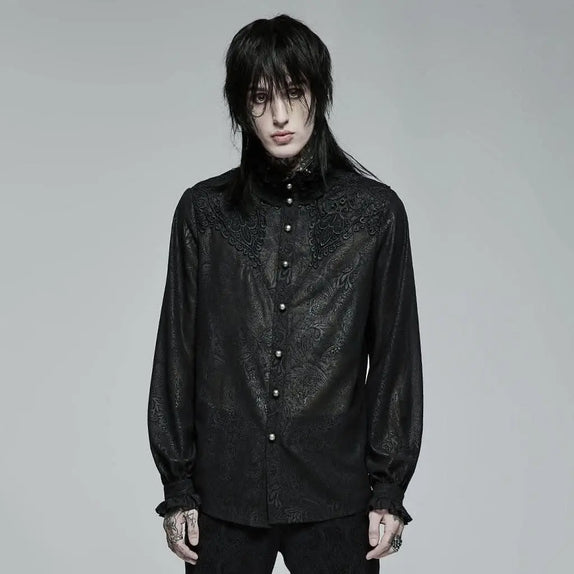 Designed with full sleeves, this shirt features a high collar and ruffled cuffs and neckline, adding a dramatic flair to your gothic wardrobe. The button-up design allows for versatile styling, whether you're dressing up for a night of enchantment or adding a touch of sophistication to your everyday look. The center-front is elegantly decorated with gothic lace, enhancing its dark romantic appeal.