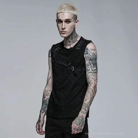 Unleash your rebellious spirit with the Mastas Tank Top, a must-have for any gothic fashion enthusiast. This tank top is crafted from a stretchable fabric, expertly spliced with distressed mesh to create a look that's both edgy and comfortable. The Mastas Tank Top is designed to make a bold statement, featuring nylon straps adorned with striking silver alloy studs and buckles.