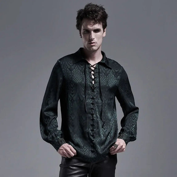 Unveil your inner gothic aristocrat with the Monte Christo Shirt in Green. This exquisite shirt embodies the essence of Victorian elegance and vampiric allure. Crafted from luxurious jacquard fabric, the shirt showcases a captivating blend of black and green hues, perfect for those who appreciate the darker side of fashion.