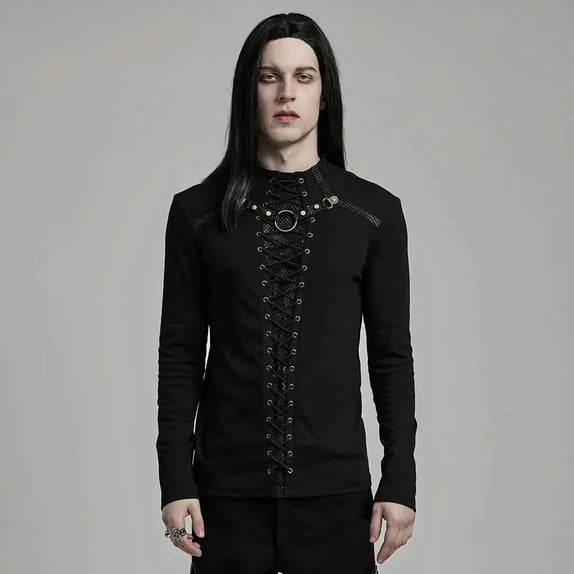 Step into the shadows with the Nyxbound Top, a must-have for any gothic fashion enthusiast. This striking top features a high neckline and full sleeves, embodying an aura of mystery and sophistication. The Nyxbound Top is designed with PU splicing, enhancing its bold, modern aesthetic. The decorative tie-up panel on the front not only adds a unique touch but also elevates the top's edgy appeal, making it a standout piece in your wardrobe.