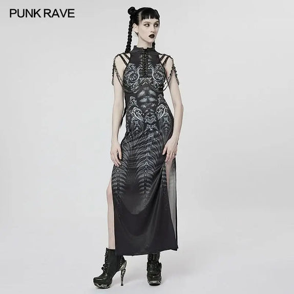 This punk printed maxi dress with chains features a high neckline with a lace panel and PU straps with chains.