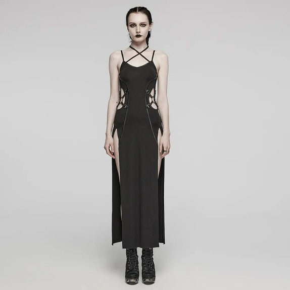 Astral Maxi Dress is crafted from soft and comfortable stretch knit fabric and it has a tie-up neckline with suspenders. It features creative waist cut-outs complemented by faux leather panelling on the front. With seductive high slits on the thighs, along with an adjustable string at the back, this piece exudes both style and sensuality.