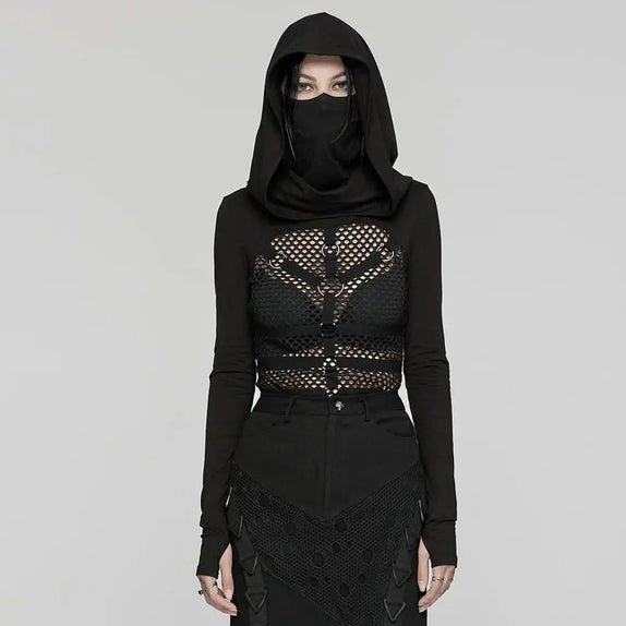 Embrace the shadows and ignite your gothic style with the Cinderwake Top, a must-have for any dark fashion enthusiast. This captivating top features full sleeves, a hood, and an integrated mask, perfect for those who wish to make a bold statement. The Cinderwake Top is expertly crafted with mesh splicing, adding a touch of mystique and allure to your ensemble.