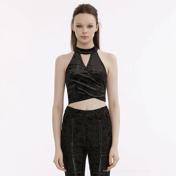 Pair it with high-waisted skirts or your favorite distressed jeans to create a look that is both mysterious and alluring. The high neck collar, adjustable with press-ons, adds an extra layer of intrigue, while the velvet fabric ensures you remain the center of attention. Dare to be different and let your style speak volumes with this captivating piece.