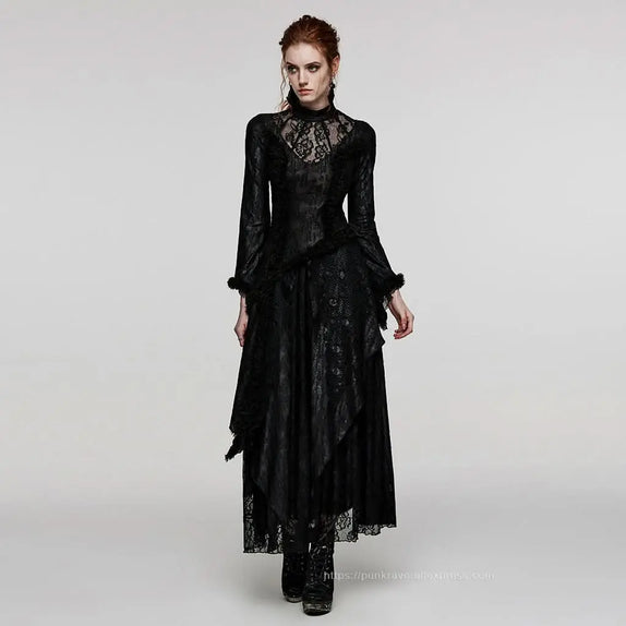 Step into a realm of mystique and sophistication with the Eidolic Maxi Dress, a masterpiece of gothic fashion that captures the essence of dark elegance. This enchanting maxi dress is designed with a high neckline and full sleeves, offering a timeless silhouette that exudes both mystery and grace. The layered skirt adds a dramatic flair, perfect for making a statement at any gothic gathering or moonlit soirée.