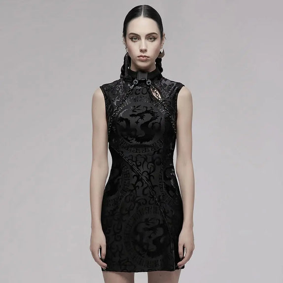 Unleash your inner warrior with the Kill Bill Cheongsam Mini Dress, a striking blend of gothic allure and Eastern elegance. This captivating mini dress features an embossed dragon print that commands attention, while the Cheongsam-inspired neckline adds a touch of traditional charm. Perfect for those who dare to stand out, this dress embodies a unique fusion of East Asian and Western aesthetics.