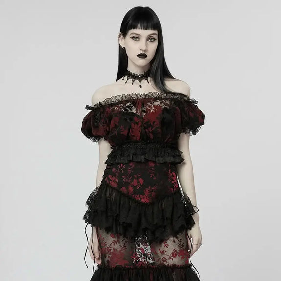Embrace the allure of gothic elegance with the 'Lady Anne' Lace Top, featuring a captivating Bardot neckline. This exquisite top, available in striking red and black, is a must-have for any gothic fashion enthusiast. The delicate lace borders the neckline and waistline, adding a touch of romantic sophistication to your wardrobe.
