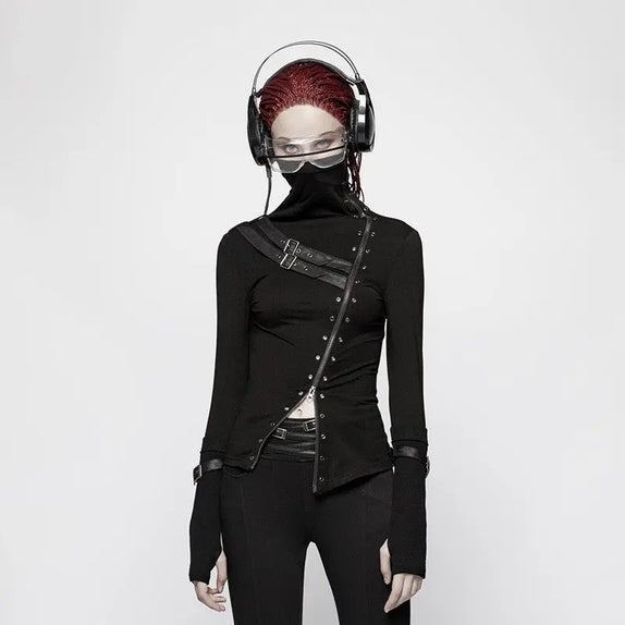 Featuring a high collar that seamlessly transforms into a mask, this top adds an enigmatic edge to your ensemble. The intricate belts and eyelet decorations are not just embellishments; they are symbols of your untamed spirit. The zipper detail offers both functionality and a touch of rebellious flair, while the long sleeves with thumb holes provide an extra layer of intrigue and comfort.