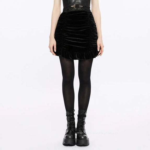 Nosferatu's Enigma Gothic Mini Skirt features ruffles, and the waistline is adorned with floral lace. The skirt can be cinched customisably. There is a concealed zipper on the back.