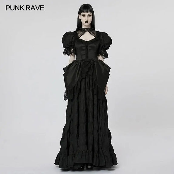 This gothic dress features bubble sleeves, a high neckline, a long A-line skirt and a high neckline that is decorated with beads and lace.