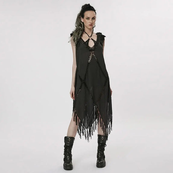 Embrace your inner enchantress with the dress's gothic-inspired lace motifs, which weave a tale of mystery and allure. The black grunge-style tassels on the hem add a rebellious edge, making this dress a must-have for any gothic fashion aficionado. Whether you're attending a moonlit soirée or a gothic gathering, the Reverie Flapper Dress promises to be your ultimate style companion.