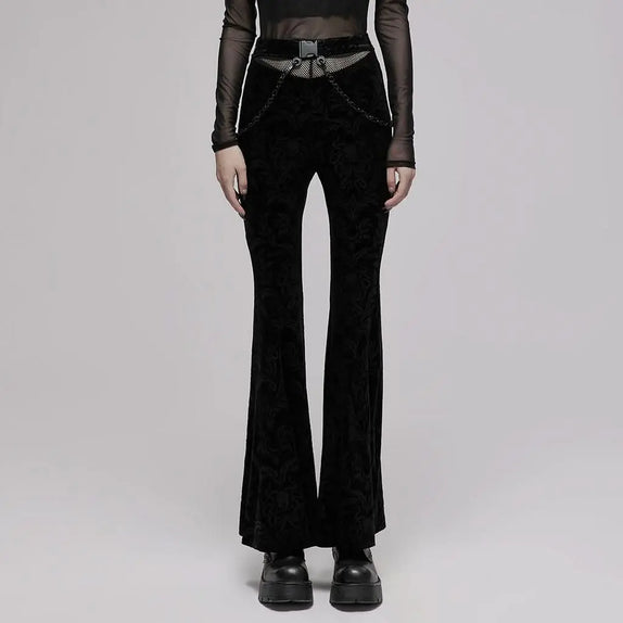 Unleash your inner darkness with the Gravebloom Velvet Pants, the epitome of gothic elegance and bold style. Crafted from luxurious dark-grain printed velvet, these pants are a must-have for any gothic fashion aficionado. The unique peek-a-boo mesh waist segment adds a tantalizing touch of allure, making these pants a statement piece in any wardrobe.