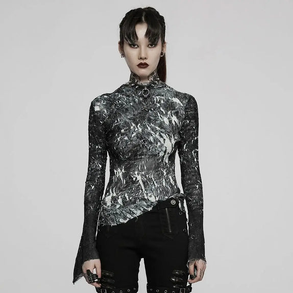 Crafted from a stretchable fabric, this turtleneck offers both comfort and style, easily adapting to your movements while maintaining its bold silhouette. The printed design is perfect for those who dare to stand out and embrace their rebellious side. Whether paired with leather pants or a flowing skirt, this top is versatile enough to complement any gothic ensemble.