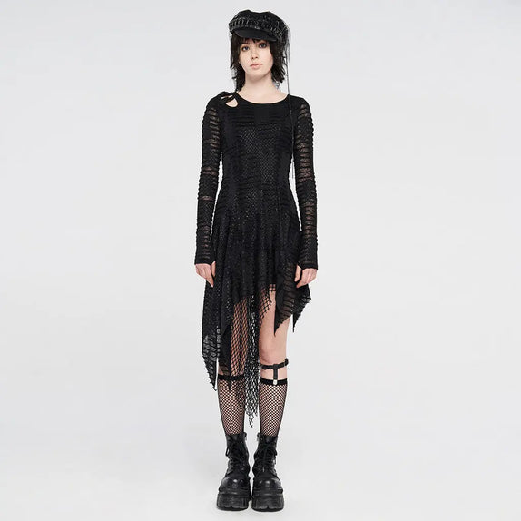 With its see-through textured grunge-style sleeves, the dress offers a tantalizing glimpse of your mysterious side. The asymmetrical layers of ripped and fishnet fabric create a dynamic silhouette, adding depth and drama to your look. The daring cut-out detail on the shoulder, adorned with black metallic buckles and eyelets, adds an extra dose of rebellious charm.
