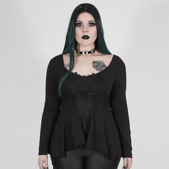 The Wolf Moon Top features a striking see-through lace applique on the bust, adding a touch of feminine mystique. The adjustable corset-style lacing at the back allows you to accentuate your waist, creating a captivating hourglass shape. Its long sleeves and asymmetrical hem add a dramatic flair, perfect for those who dare to embrace their inner witch.