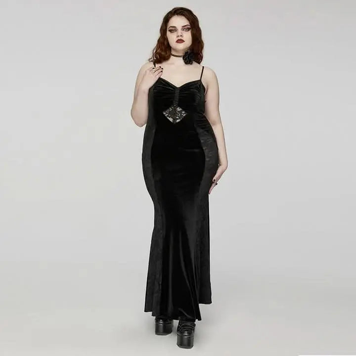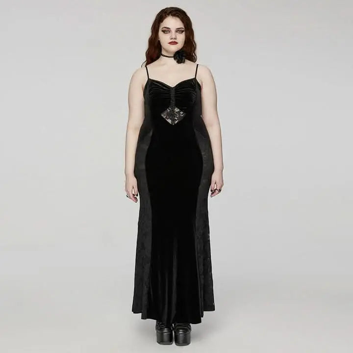 The Ebonshade Dress features a sumptuous velvet fabric that cascades to the floor, creating a silhouette that is both dramatic and graceful. Intricate lace accents adorn the neckline and sleeves, offering a touch of timeless enchantment that is quintessential to gothic fashion. The structured bodice seamlessly transitions into a flared hem, crafting a silhouette that exudes both strength and elegance.