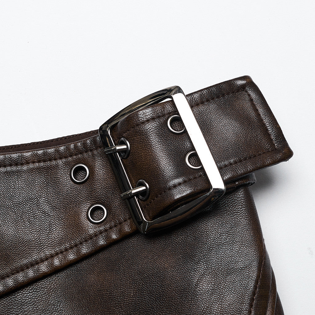 Chronos Mini Skirt is crafted from synthetic leather and mesh. It has an A-line silhouette and zippers on both sides that can be opened to reveal mesh accents underneath. There is a zipper on the back