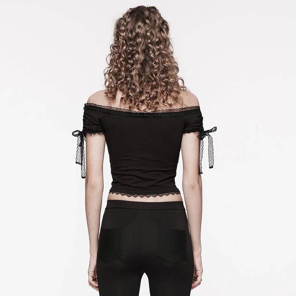 The off-shoulder cut exudes effortless allure, while eyelet-adorned straps on the sleeves introduce a raw, metallic contrast that elevates the design. With its slim-fit silhouette and flexible fabric, the Tenebric Top is as comfortable as it is striking.