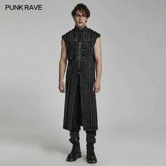 Necropolis Denim Vest features denim fabric, a zipper at the centre front and metal