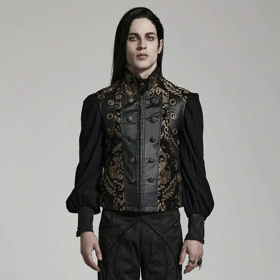 This gothic waistcoat features a high collar and patterned fabric exterior.