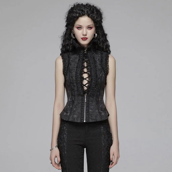Step into the realm of gothic elegance with the Portrait of Isabella Vest, a stunning piece that captures the essence of dark romance. This exquisite black jacquard vest is designed for those who appreciate the finer details of gothic fashion. The standing lace collar adds a touch of regal sophistication, while the front zipper ensures both style and convenience. Delicate ribbon decorations adorn this vest, offering a subtle yet striking contrast against the rich fabric.