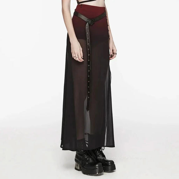 Step into the shadowy allure of gothic fashion with our Crepuscular A-Line Skirt, a striking piece that embodies the essence of dark elegance. This red skirt is crafted with a sheer fabric that gracefully flows into an A-line silhouette, offering a mesmerizing blend of mystery and sophistication. Perfect for those who revel in the enigmatic, this skirt is a must-have for any gothic wardrobe.