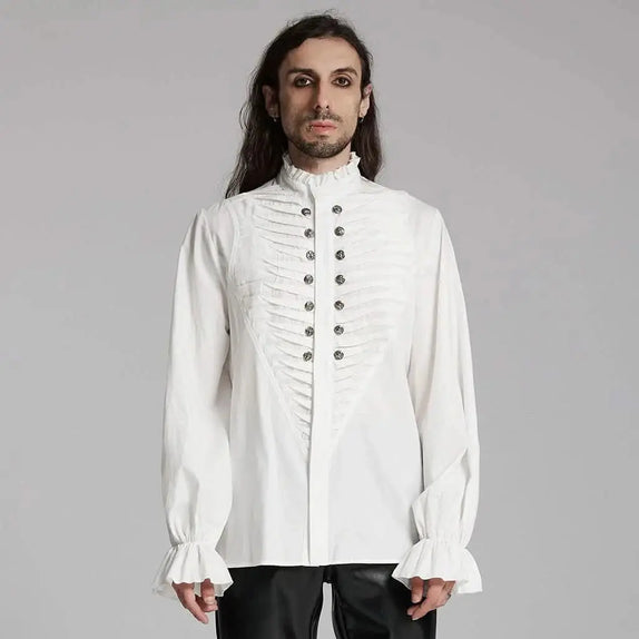 Embrace the allure of gothic elegance with the Occuvex Buckle Shirt, an essential piece for aficionados of Victorian and steampunk fashion. This exquisite shirt features intricate pleated ruffles and ornate decorative buttons, making it a standout addition to any gothic wardrobe. The flowing cuffs add a dramatic flair, perfect for those who appreciate the finer details of gothic style.