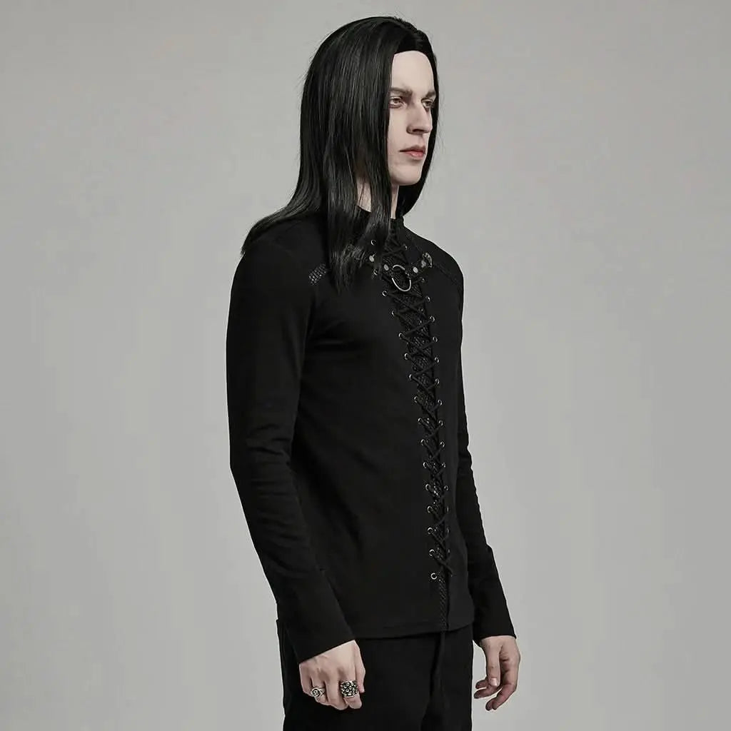 Step into the shadows with the Nyxbound Top, a must-have for any gothic fashion enthusiast. This striking top features a high neckline and full sleeves, embodying an aura of mystery and sophistication. The Nyxbound Top is designed with PU splicing, enhancing its bold, modern aesthetic. The decorative tie-up panel on the front not only adds a unique touch but also elevates the top's edgy appeal, making it a standout piece in your wardrobe.