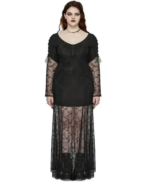 Step into the shadows with the enchanting Requiem Maxi Dress, a masterpiece for those who cherish gothic elegance. This maxi dress captivates with its exquisite floral mesh fabric, offering a delicate yet dark allure that is perfect for any nocturnal gathering. The intricate lace trim on the cuffs adds a touch of vintage romance, making this dress a timeless addition to your gothic wardrobe.