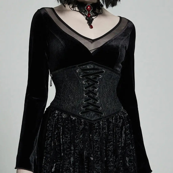 Exprimez votre vamp intérieure avec le corset Mystic Sanctuary. Cette ceinture corset sous la poitrine est fabriquée à partir d'un mélange de polyester noir et d'acrylique. Ce serre-taille gothique à baleines est doublé de 100 % coton. Son tissu en brocart est délicatement fleuri, il comporte également un laçage décoratif sur le devant et un laçage réglable à l'arrière, le tout complété par un panneau de pudeur assorti, un ruban de velours et des œillets métalliques argentés robustes.